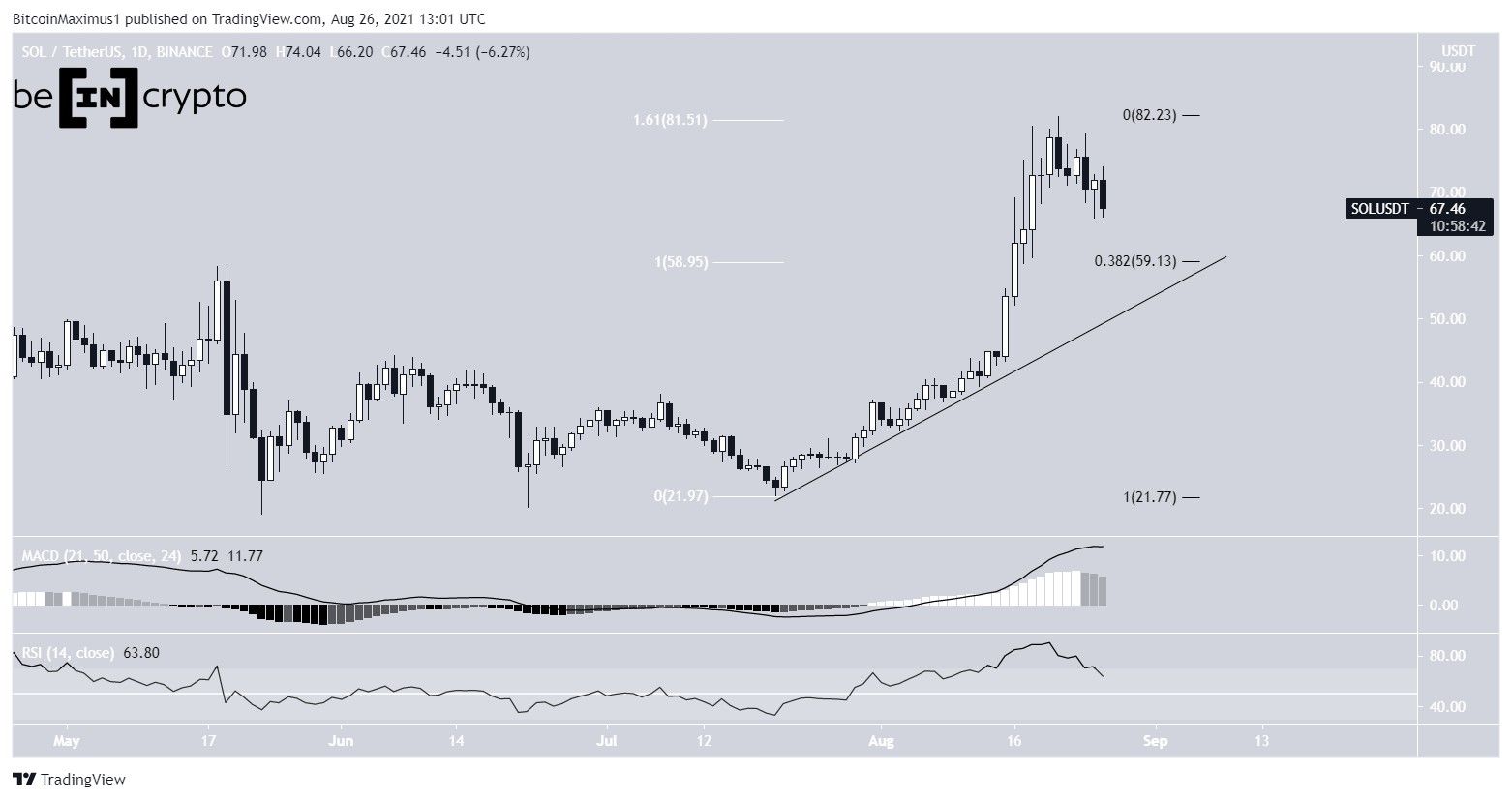 Giá SOL đã tăng lên cùng với đường hỗ trợ tăng dần kể từ ngày 20 tháng 7. Vào ngày 21 tháng 8, SOL tạo đinh mới tại 82 đô la.