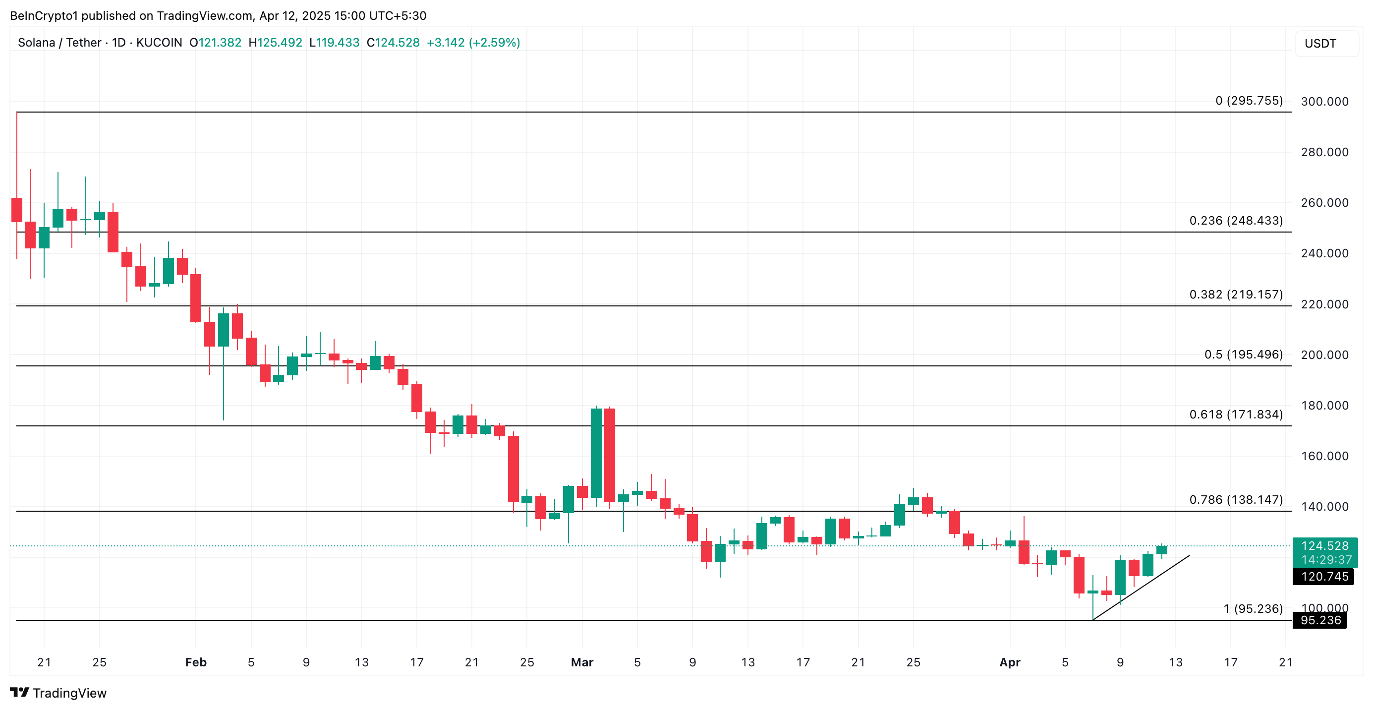 Kể từ khi SOL bắt đầu đợt tăng giá hiện tại, giá trị của nó đã tăng 17%. Tại thời điểm viết bài, altcoin này đang giao dịch ở mức 124.58 USD, nằm trên một đường xu hướng tăng.