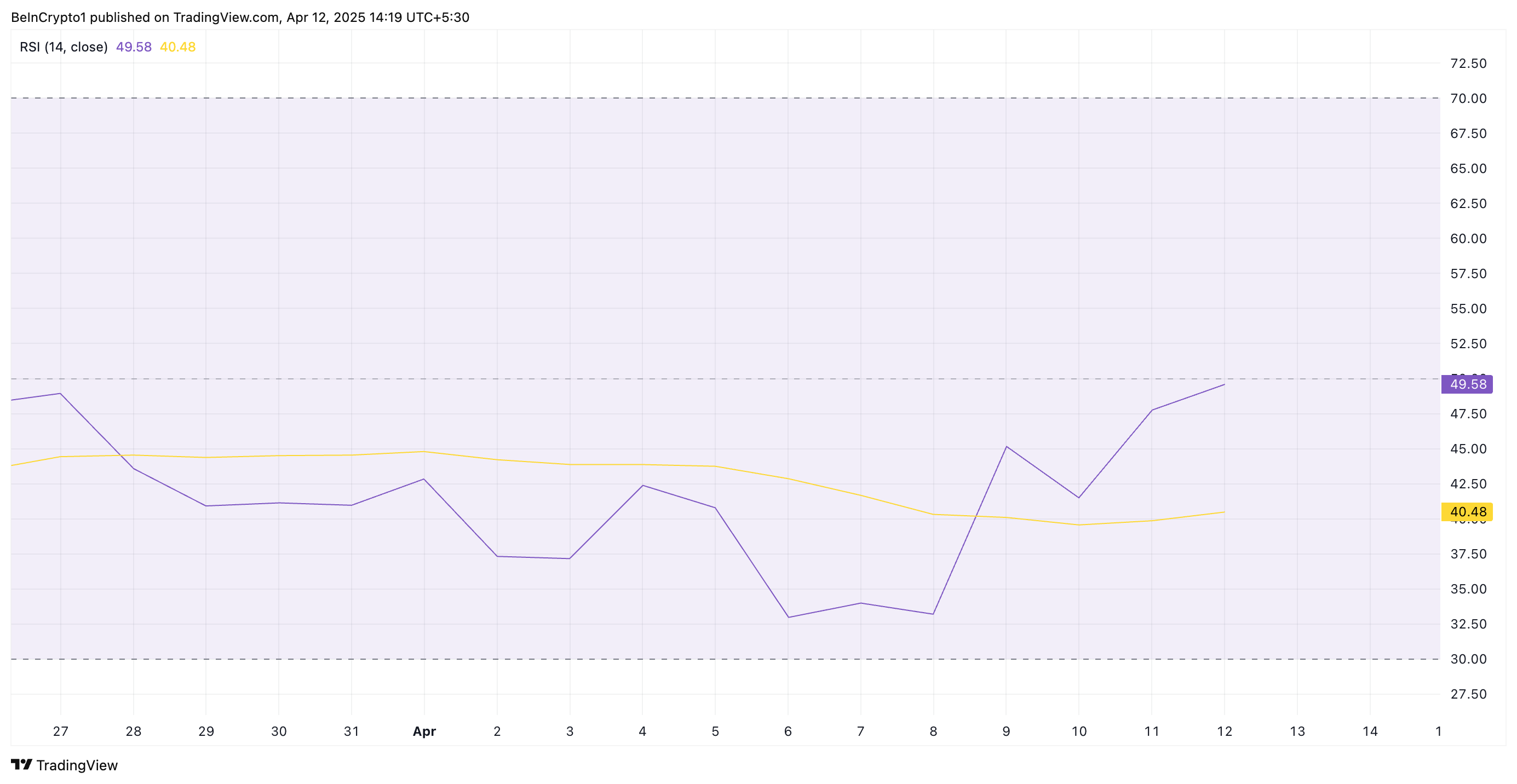 Sự phục hồi của SOL còn được hỗ trợ bởi chỉ số Relative Strength Index (RSI) đang tăng, cho thấy sự quan tâm mua vào đang tăng lên. Chỉ báo động lượng này đang ở mức 49.58 tại thời điểm viết bài, sẵn sàng vượt qua đường trung lập 50.