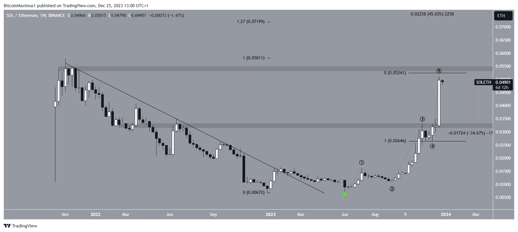 Phân tích kỹ thuật khung thời gian hàng tuần đối với cặp SOL/ETH cho thấy rằng mặc dù đã bứt phá khỏi đường xu hướng kháng cự giảm dần dài hạn vào đầu năm, giá SOL đã không tăng tốc cho đến tháng 6 (biểu tượng màu xanh lá cây). Thay vào đó, Ethereum vượt trội hơn Solana trong nửa đầu năm và xu hướng đã đảo ngược trong nửa sau. Giá đang tiến đến vùng cao nhất mọi thời đại là 0.055 ETH. Tuy nhiên, đà tăng đã trở nên hoàn toàn theo đường parabol.