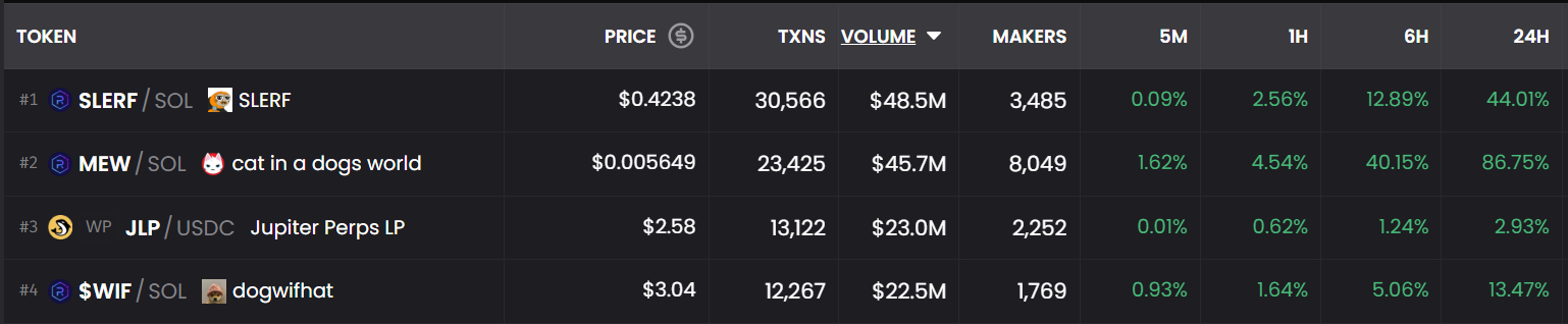 Trong vòng 24 giờ qua, chỉ riêng SLERF đã ghi nhận khối lượng ấn tượng 48.5 triệu USD. Các cặp MEW/SOL và WIF/SOL cũng chứng kiến hoạt động đáng kể, tạo ra khối lượng lần lượt là 45.7 triệu USD và 22.5 triệu USD. Những đồng tiền meme này cũng đã chứng minh hiệu suất giá mạnh mẽ. MEW đã trải qua mức tăng đáng chú ý 86.75% trong vòng 24 giờ, trong khi WIF và SLERF ghi nhận mức tăng lần lượt là 13.47% và 44.01%. Raydium, một DEX Solana hàng đầu, đã đóng một vai trò quan trọng trong việc tạo điều kiện cho sự gia tăng khối lượng này.