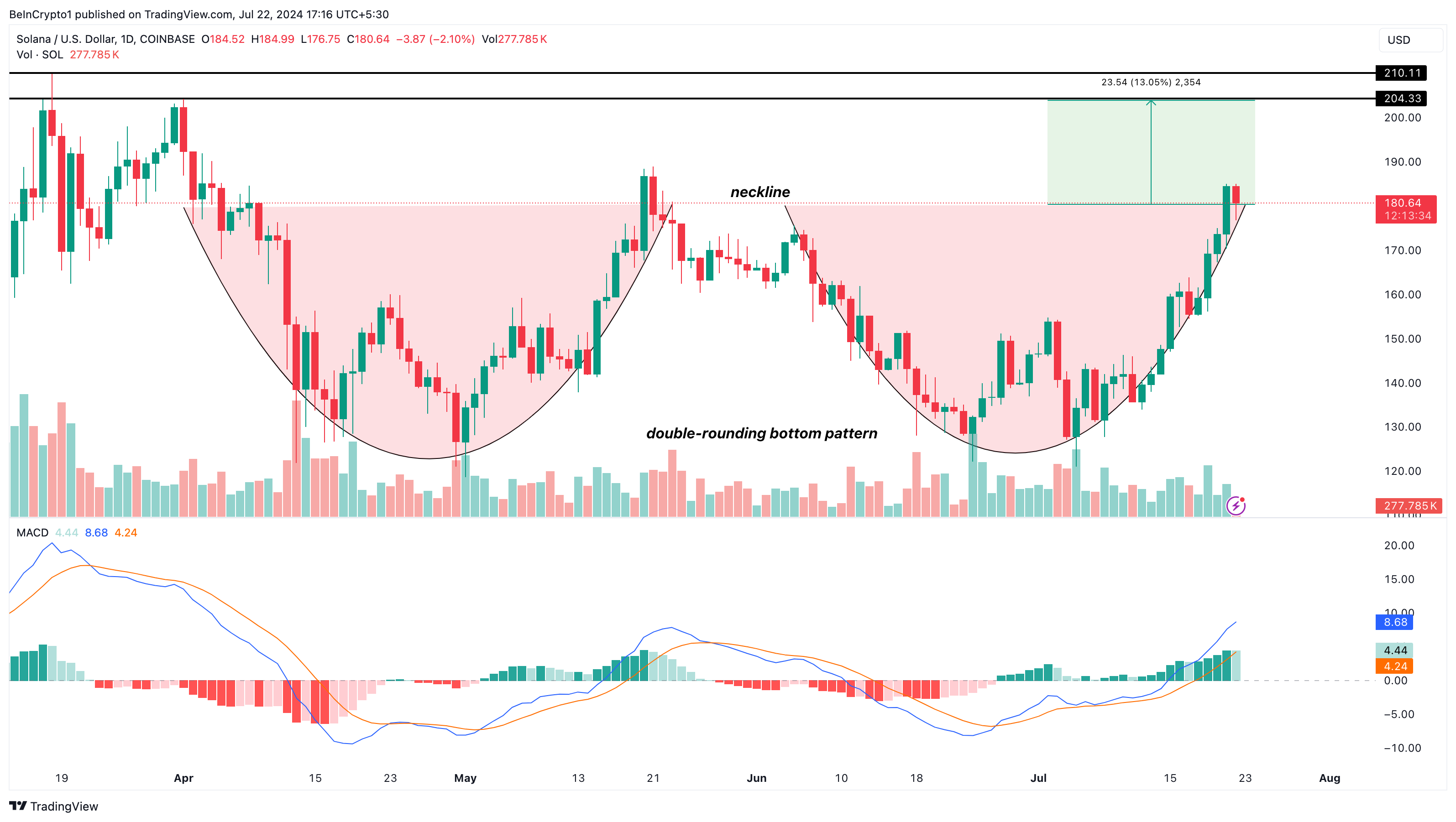 Từ ngày 18/07 đến 21/07, SOL đã hình thành 4 nến xanh liên tiếp, khiến giá tăng lên 185.21 USD. Theo quan sát của chúng tôi, sự tăng giá này đã giúp token hình thành một mẫu đáy kép tròn trên biểu đồ hàng ngày. Thông thường, mẫu này đánh dấu sự kết thúc của xu hướng giảm, và với đường cổ áo tại 180.30 USD, giá của SOL có thể sẵn sàng cho một đợt bùng nổ.