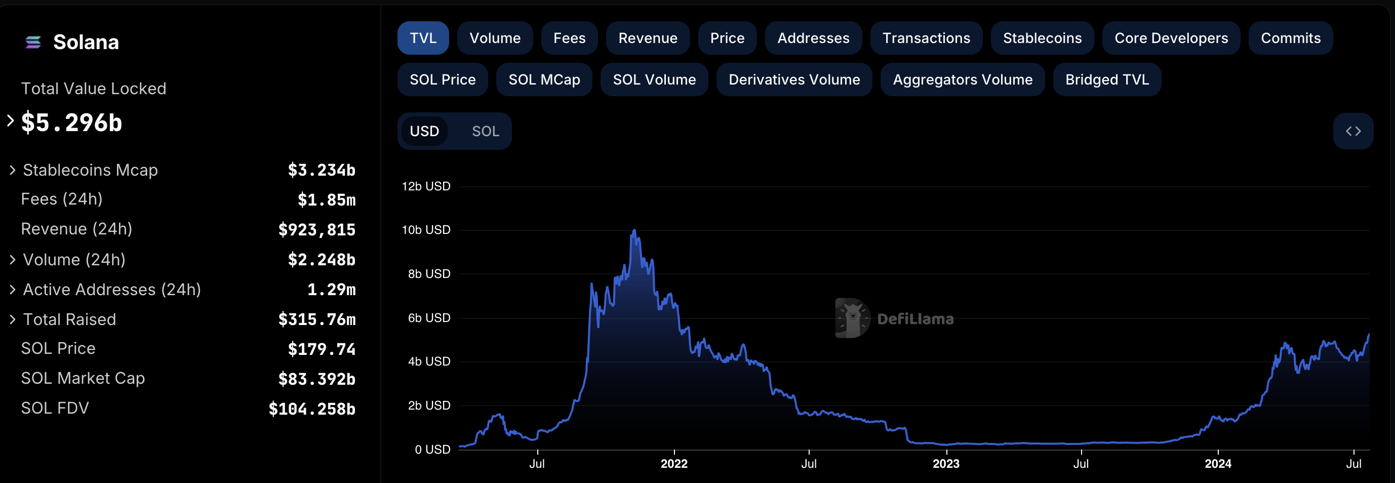 SponsoredHơn nữa, dữ liệu xác nhận rằng tổng giá trị bị khóa (TVL) đã có xu hướng tăng từ ngày 03/07, khi nó đã giảm. TVL là giá trị của các tài sản được khóa hoặc staking trong một giao thức và đo lường sức khỏe của một mạng. Tại thời điểm viết bài, TVL của Solana là 5.29 tỷ USD, cao hơn mức trước khi thị trường gấu năm 2022 bắt đầu.
