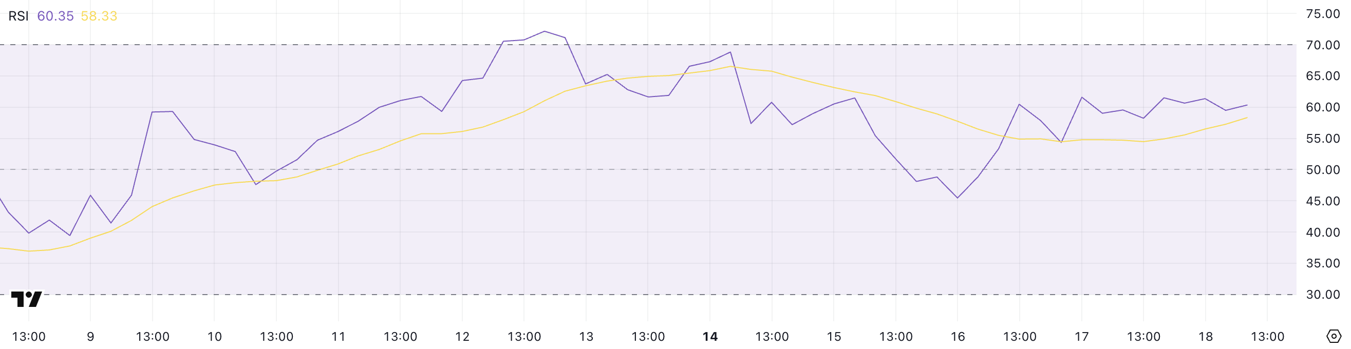 RSI là một bộ dao động động lượng đo lường tốc độ và cường độ của các chuyển động giá, dao động từ 0 đến 100. Các giá trị trên 70 thường chỉ ra rằng một tài sản đang quá mua và có thể cần điều chỉnh, trong khi các chỉ số dưới 30 cho thấy điều kiện quá bán, có thể báo hiệu cơ hội mua.