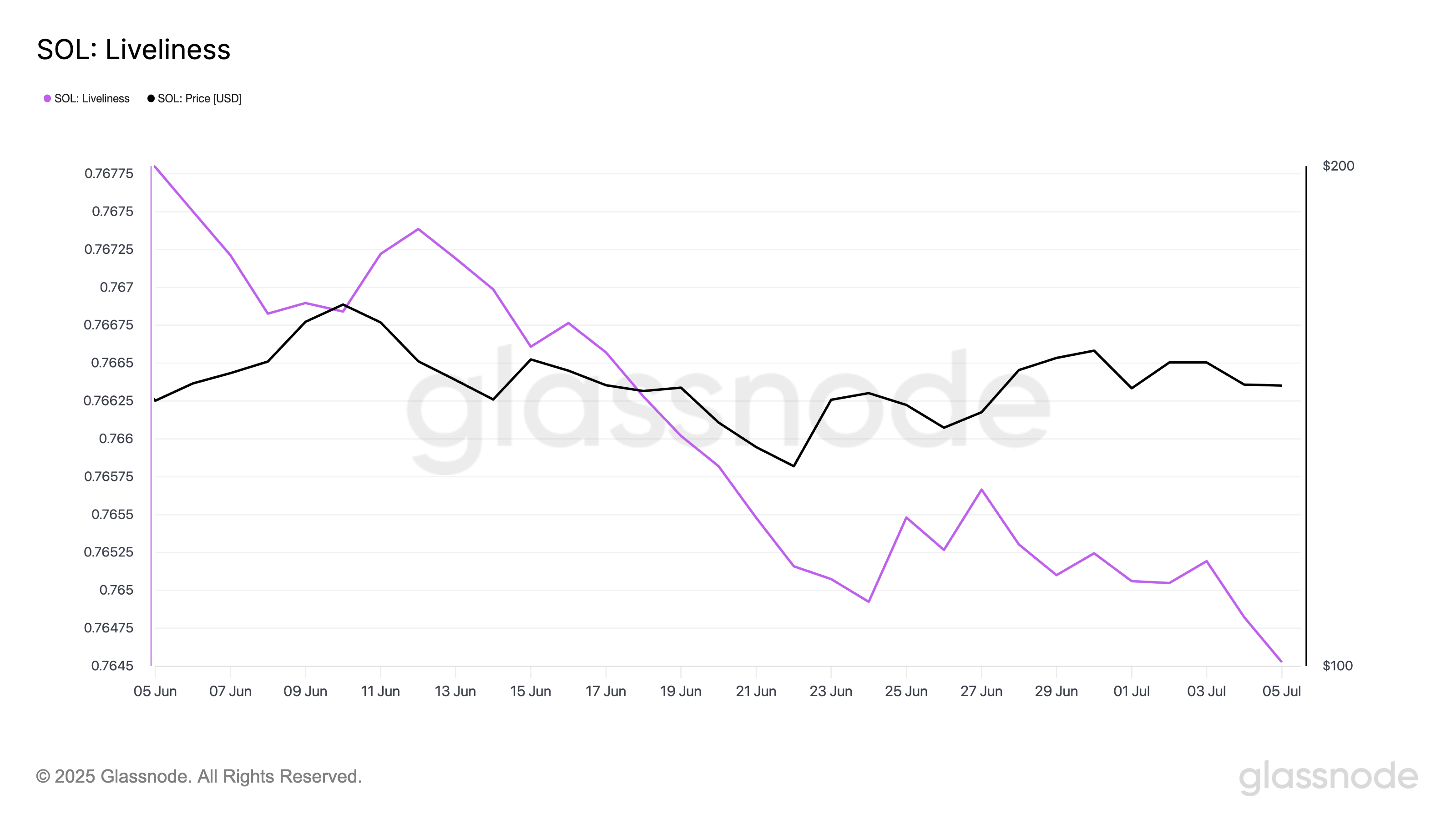 Dữ liệu từ Glassnode cho thấy Liveliness của SOL đã có xu hướng giảm kể từ khi đạt mức cao nhất trong 90 ngày vào ngày 04/06. Chỉ số này, theo dõi sự di chuyển của các token trước đây không hoạt động, đã giảm xuống mức thấp nhất trong 30 ngày là 0.764 vào ngày hôm qua, cho thấy sự giảm đáng kể trong việc bán ra của các LTHs của SOL.