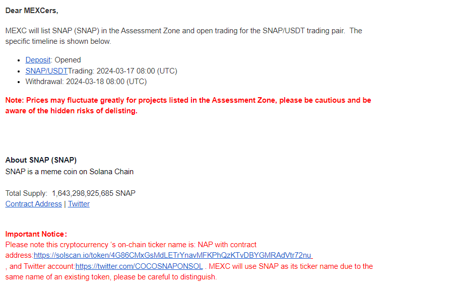 Một điểm khác khiến NAP trở nên thu hút được cộng đồng trong thời gian ngắn là việc mới đây sàn MEXC cũng sẽ hỗ trợ niêm yết tại Assessment Zone và cho phép giao dịch meme coin này vào lúc 08:00 ngày 17/3/2024 (UTC). MEXC cho biết họ sẽ sử dụng SNAP làm ticker name thay vì NAP do ký tự này đã trùng với một đồng coin khác hiện có trên nền tảng.