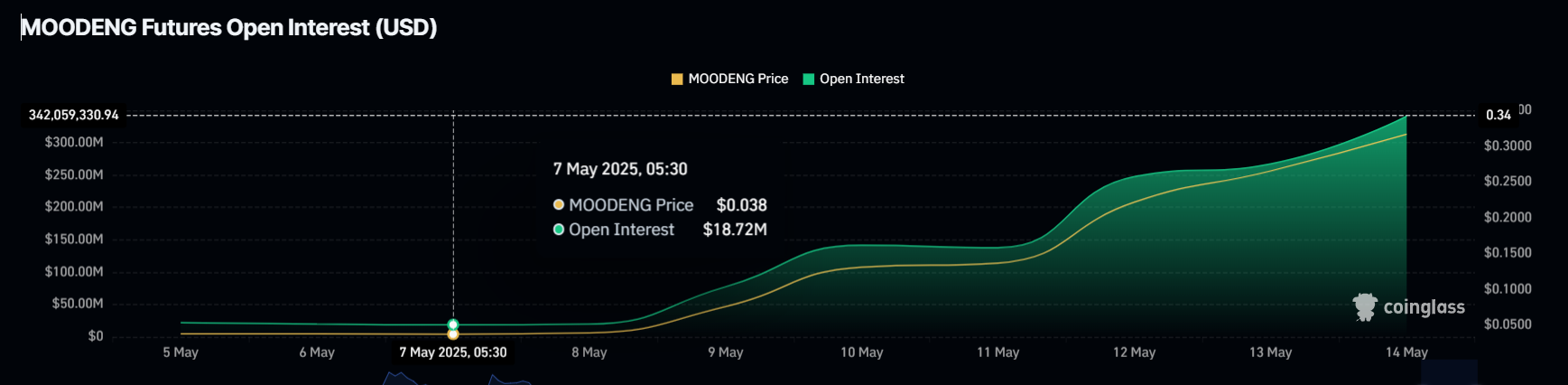 Sự tăng giá của MOODENG được thúc đẩy bởi nhu cầu tự nhiên, như được chỉ ra bởi dữ liệu Open Interest (OI). Trong tuần qua, các nhà giao dịch đã đổ 324 triệu USD vào meme coin, đẩy OI từ 18 triệu USD lên 342 triệu USD. Sự gia tăng 1,800% trong OI này cho thấy sự quan tâm mạnh mẽ của thị trường, với nhu cầu về MOODENG vượt ra ngoài hiệu suất thị trường giao ngay của nó.