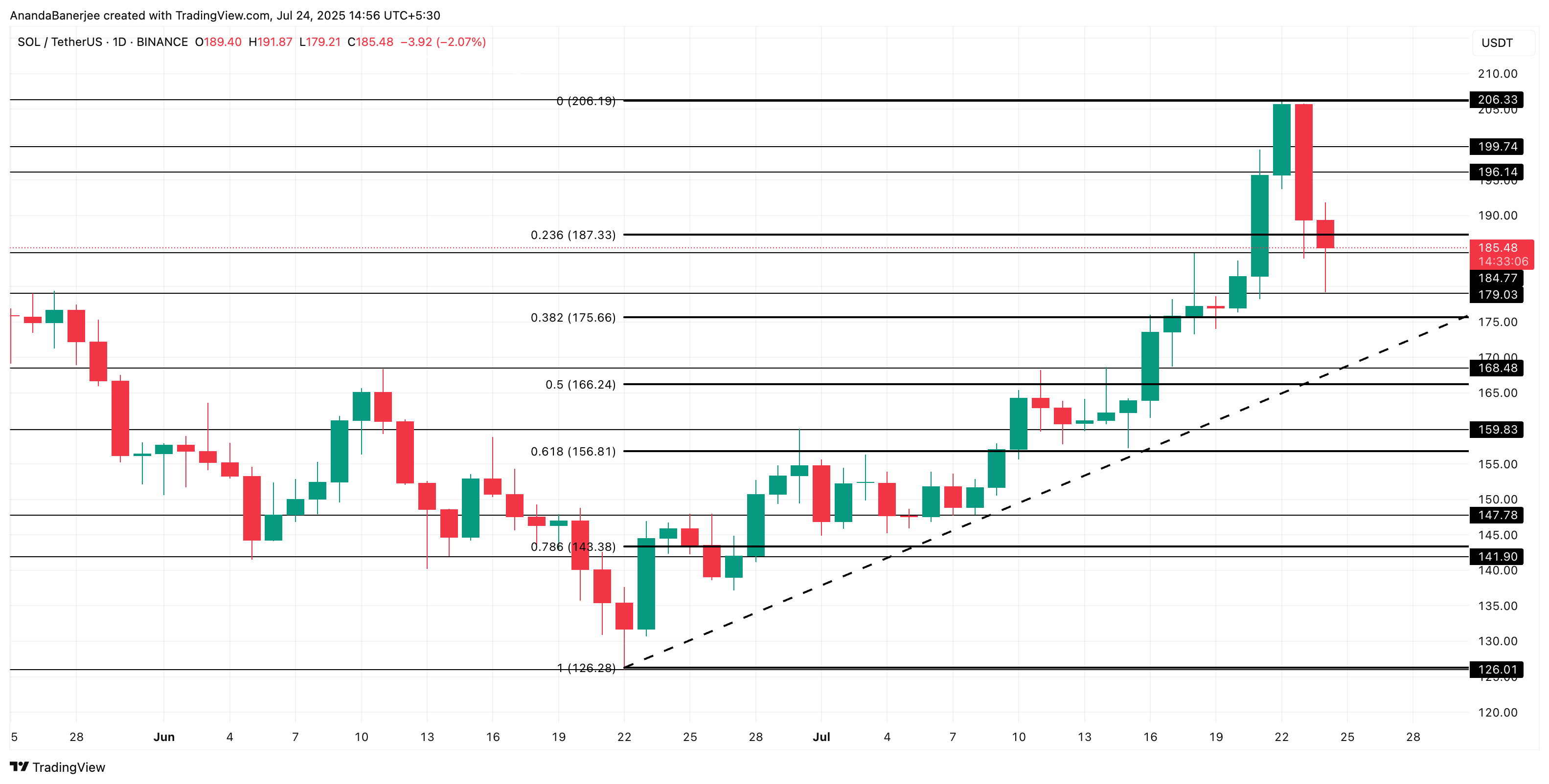 Từ góc độ kỹ thuật, giá Solana hiện đang kiểm tra mức thoái lui Fibonacci 0.236 tại 187 USD, dựa trên mức thấp tháng 06 là 126 USD và mức cao tháng 07 là 206 USD. Mặc dù mức này đã bị phá vỡ tại thời điểm viết bài, giá SOL dường như đang cố gắng lấy lại mức này.