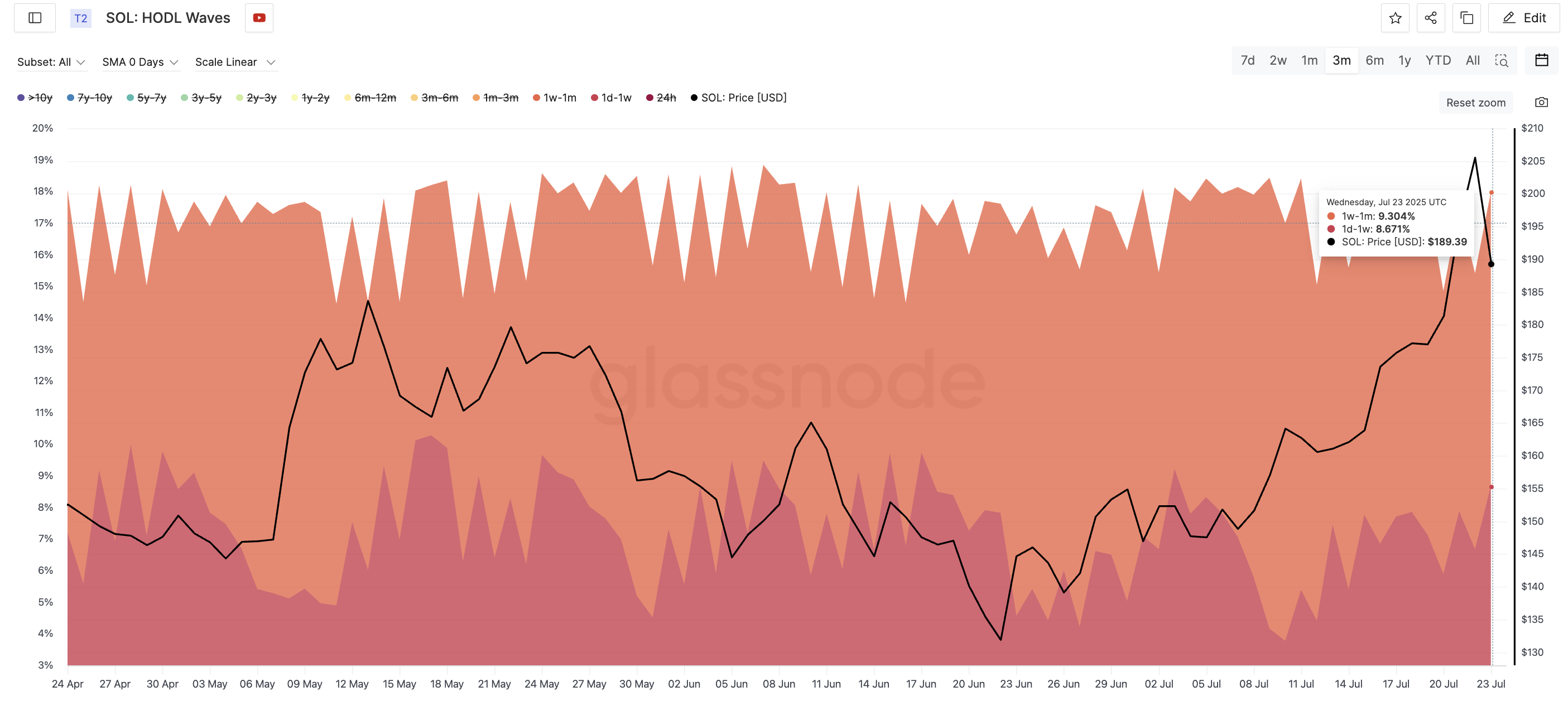 Mặc dù giá giảm, nhưng những người nắm giữ ngắn hạn không rời bỏ; họ đang tham gia. Biểu đồ HODL Waves 3 tháng cho thấy sự gia tăng trong nhóm ví “1 ngày đến 1 tuần”, cho thấy rằng những người mua mới đang tích lũy Solana.