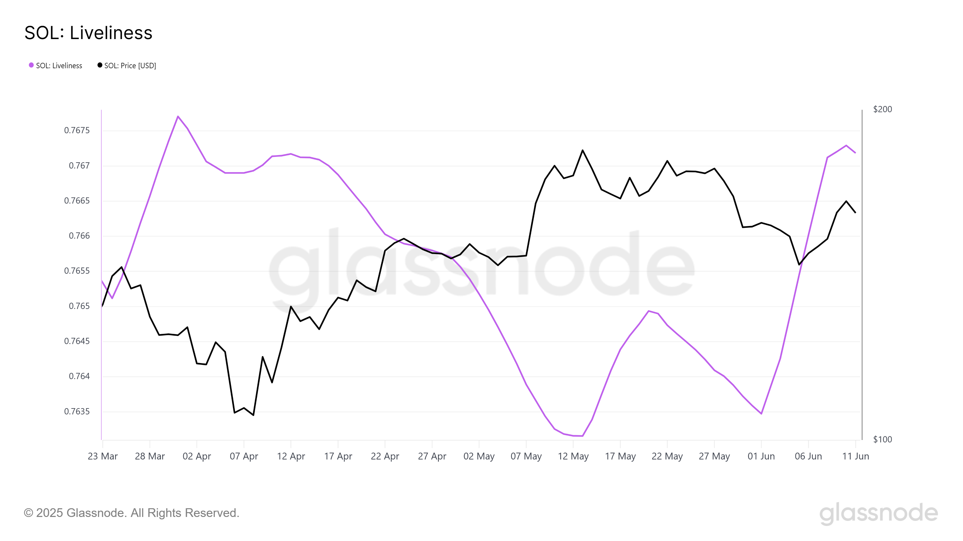 Các nhà đầu tư dài hạn (LTHs) của Solana đang có dấu hiệu bán ra, như được thấy trong sự gia tăng của chỉ số Liveliness. Chỉ số Liveliness theo dõi tần suất giao dịch từ LTHs, với sự gia tăng cho thấy hành vi bán ra. Sự gia tăng gần đây này phản ánh rằng LTHs, những người đã giữ Solana trong thời gian dài, đang chọn cách bán ra để bảo toàn lợi nhuận của họ.