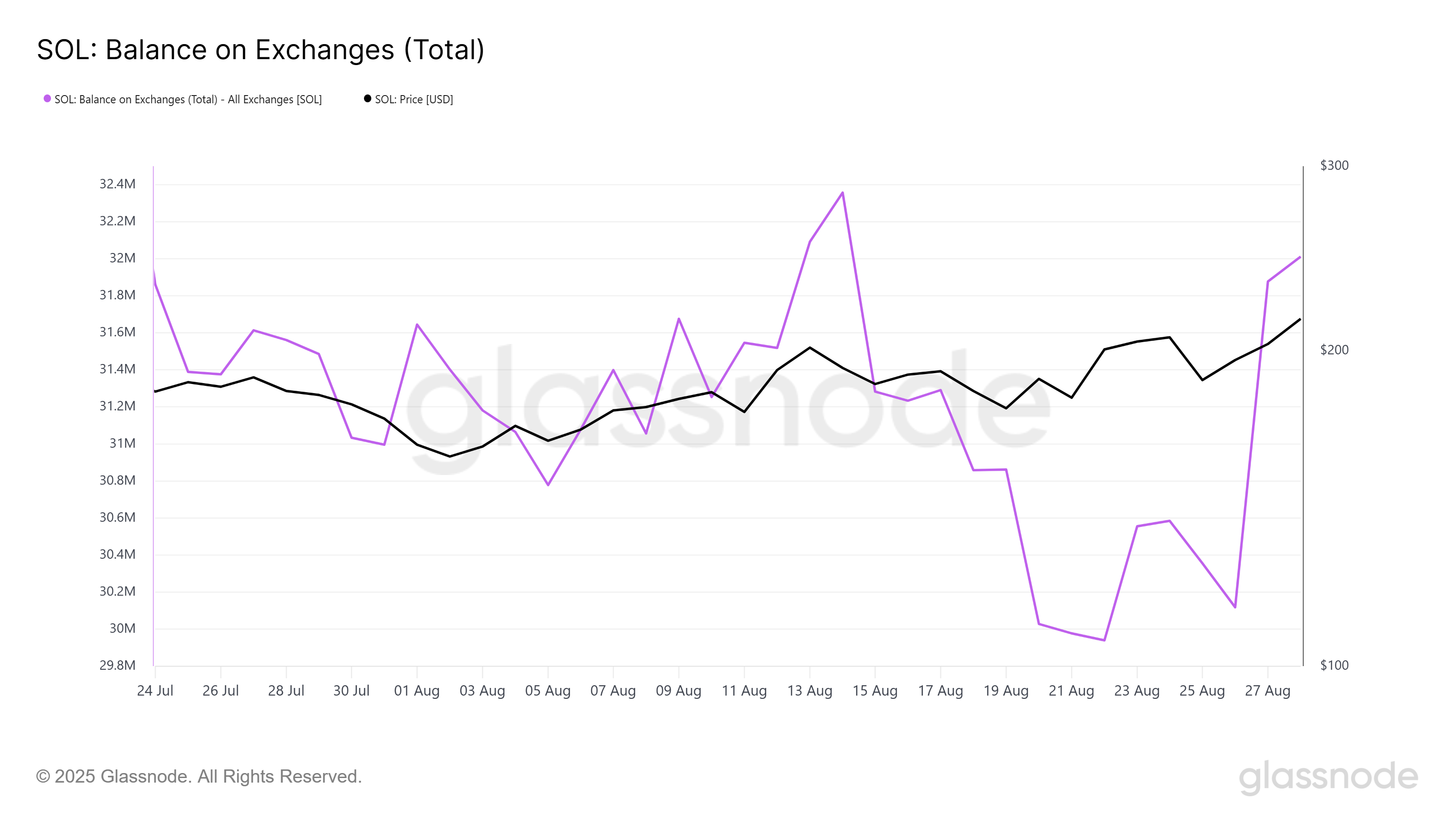 Số dư trên sàn giao dịch của Solana đã tăng mạnh trong ba ngày qua. Hơn 2 triệu SOL, trị giá hơn 432 triệu USD, đã được nạp vào các sàn giao dịch. Xu hướng này phản ánh việc các nhà đầu tư tận dụng đợt tăng giá, với nhiều người chọn bảo toàn lợi nhuận thay vì mở rộng tiếp xúc với điều kiện biến động.