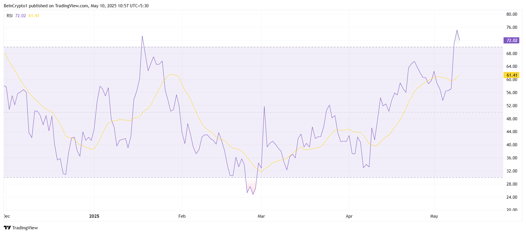 Các chỉ báo kỹ thuật của Solana cũng cho thấy động lực tăng giá có thể đang gần đạt đỉnh. Chỉ số Relative Strength Index (RSI) hiện đang trên 70.0, đặt Solana vào vùng quá mua.