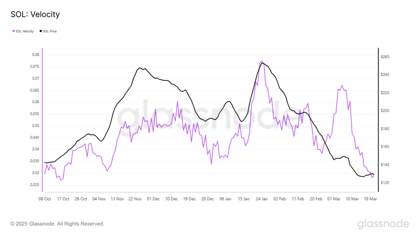 Tốc độ lưu thông của Solana đã giảm xuống mức thấp nhất trong 5 tháng, báo hiệu nhu cầu đang yếu đi. Tốc độ lưu thông đo lường tốc độ mà một tài sản được lưu hành trong thị trường. Mức lưu thông hiện tại của Solana tương đương với những gì đã thấy vào tháng 10/2024, là một chỉ báo rõ ràng rằng tiền điện tử này đang mất đà.