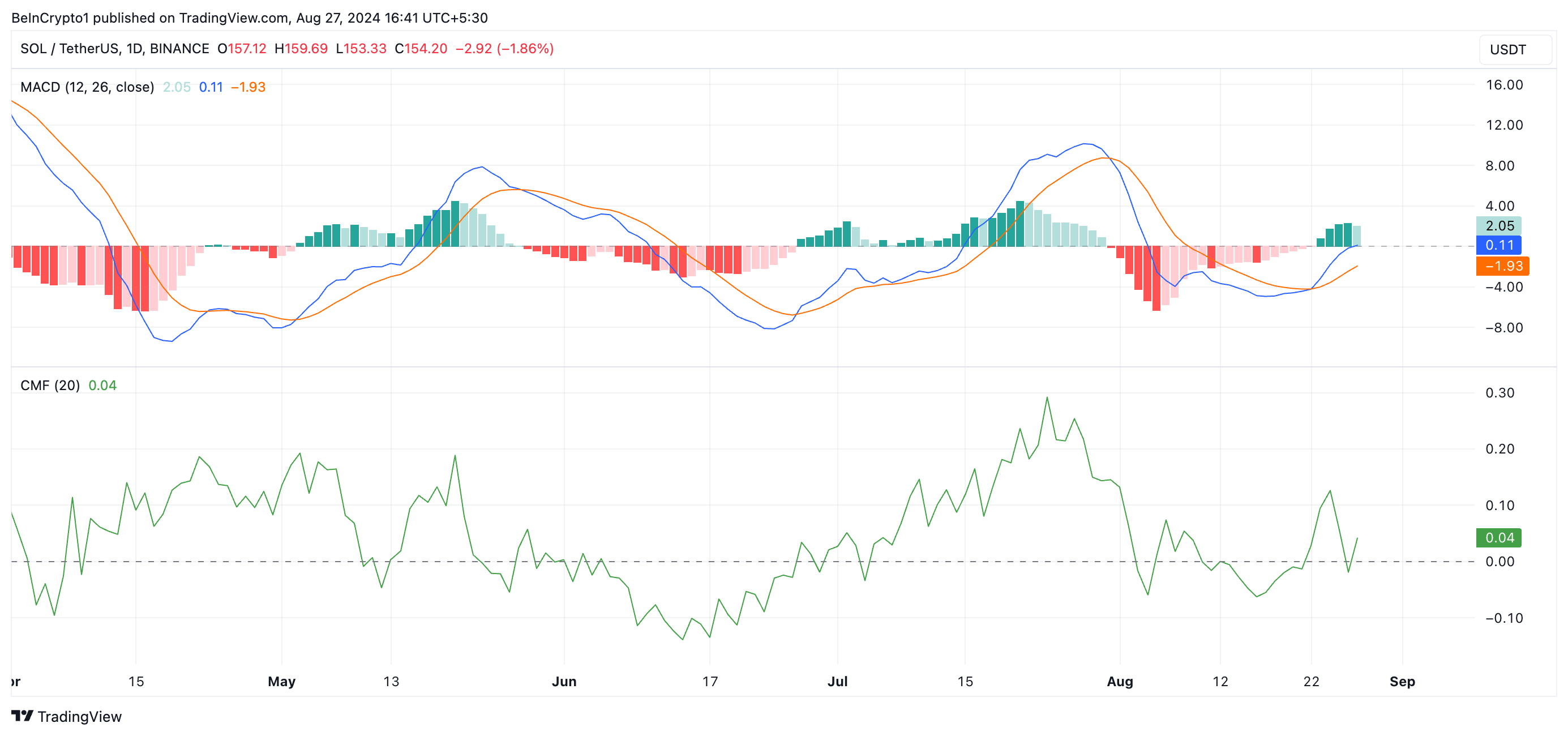 Ngoài ra, chỉ báo Chaikin Money Flow (CMF) dương của SOL củng cố triển vọng này. Tại thời điểm viết bài, CMF ở trên mức 0 tại 0.04. CMF đo lường dòng vốn vào và ra khỏi một tài sản. Khi nó có giá trị lớn hơn zero cho thấy nhu cầu thị trường mạnh và dòng tiền tích cực chảy vào. Cả hai chỉ báo nói trên đều quan trọng để duy trì một đà tăng giá.