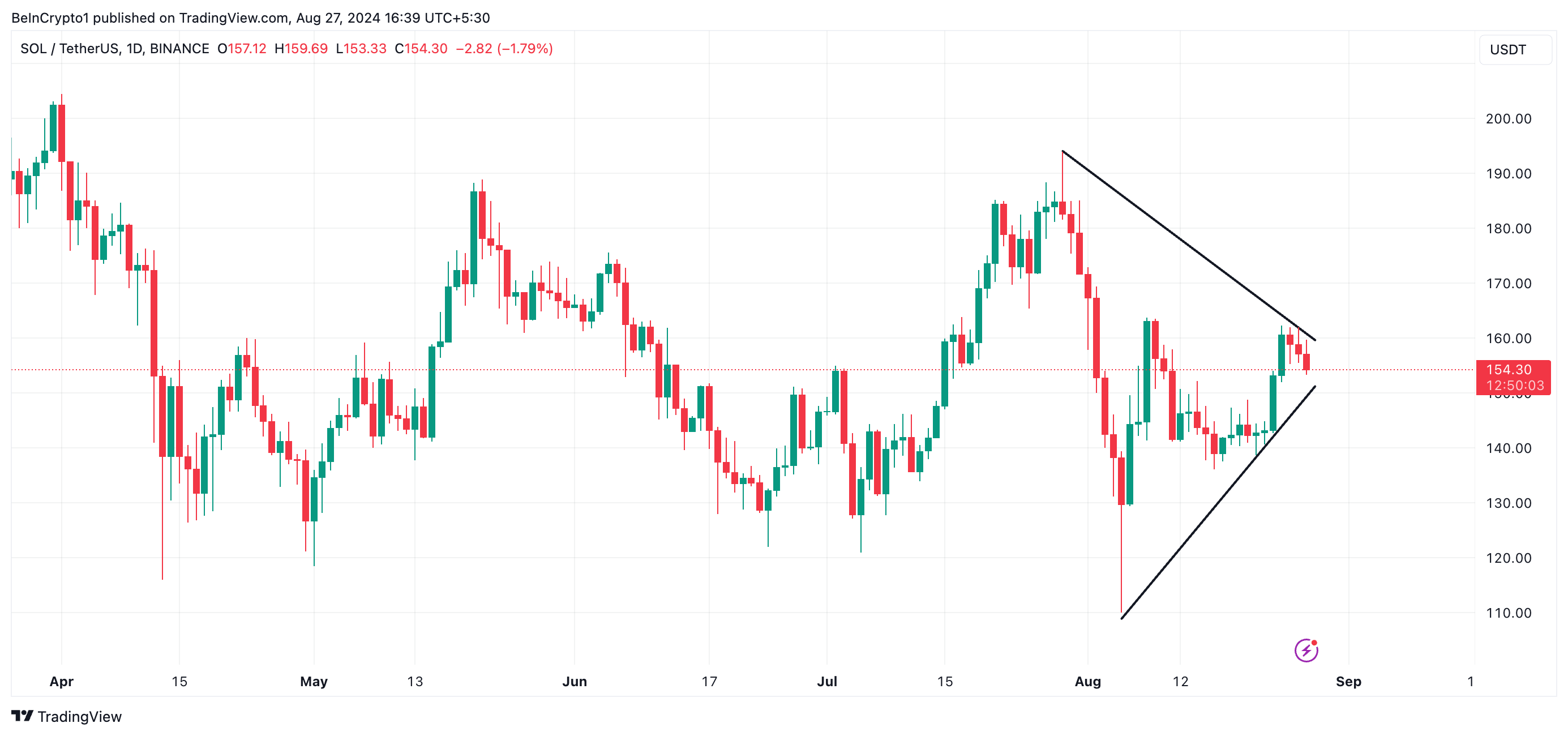 Tuy nhiên, nếu xu hướng thị trường chuyển sang giảm giá, giá của SOL có thể giảm xuống đường dưới của tam giác đối xứng tại 148.27 USD.