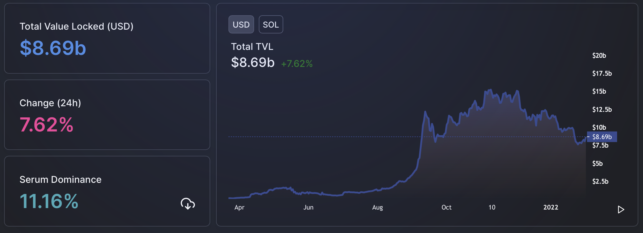 Thứ nhất, TVL của Solana vẫn ở mức tốt, khoảng 8.69 tỷ USD tại thời điểm viết bài. Mặc dù có một sự suy giảm rõ rệt so với thời điểm tháng 11/2021 nhưng nó vẫn cho thấy một tốc độ tăng trưởng vượt bật. Thậm chí, sau sự cố xảy ra ngày 24/1 vừa qua, TVL thậm chí còn xuống thấp tới 7.2 tỷ USD trước khi phục hồi về mức hiện tại. Điều này cho thấy niềm tin và tiền mặt vẫn đang đổ vào hệ sinh thái này.
