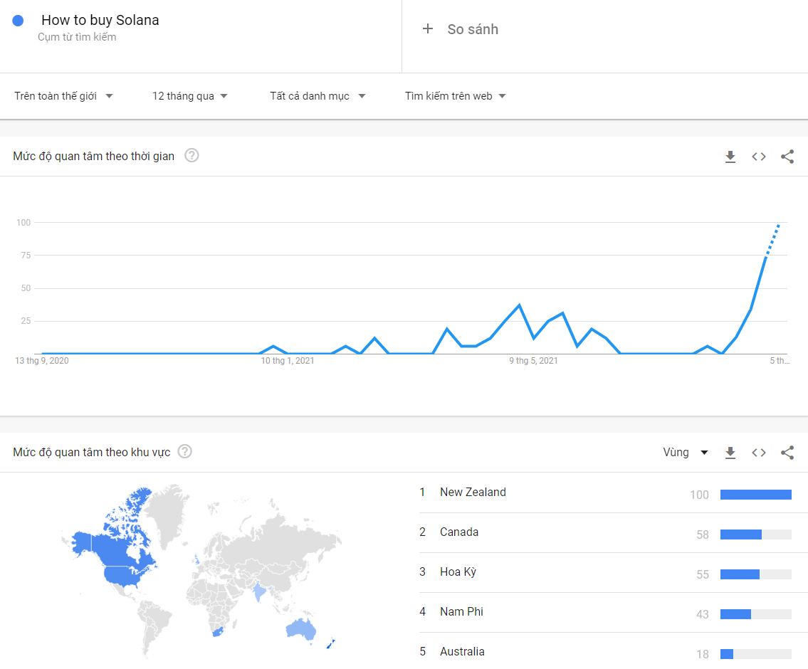 Quan sát dữ liệu từ Google Trend với từ khóa “How to buy Solana” trên quy mô toàn cầu.