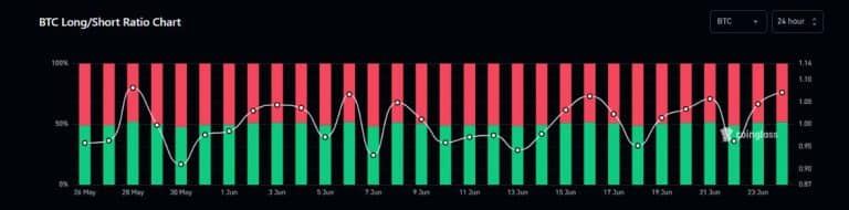 Tâm lý lạc quan dường như đang tràn ngập thị trường tương lai khi các nhà giao dịch đặt mục tiêu tăng giá vượt xa những người thuộc phe ngược lại. Theo Coinglass, các vị thế mua BTC đã tăng lên 51% trên tổng số vị thế hoạt động trên thị trường tại thời điểm viết bài.