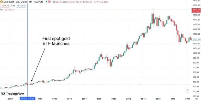 Nhưng liệu nó có thể tác động mạnh đến mức nào mà khiến người ta kỳ vọng đến vậy? Hãy cùng xem qua một trường hợp tương tự về vàng. Theo IntoTheBlock, việc ra mắt spot ETF vào năm 2003 đã cách mạng hóa giao dịch vàng. Quỹ đã giúp việc đầu tư vào kim loại màu vàng trở nên dễ dàng, dẫn đến giá trị của nó tăng nhanh chóng.