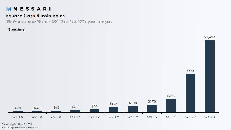 Square đã đạt được mức tăng trưởng doanh thu từ bán Bitcoin quý sau luôn cao hơn quý trước, từ 306 triệu USD trong quý 1/2020 lên 875 triệu USD trong quý 2/2020, và hiện tại là hơn 1,6 tỷ USD trong quý 3 năm nay.