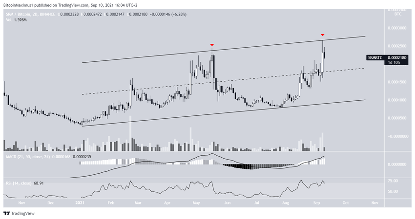 Chuyển động của cặp giá SRM / BTC không rõ ràng như chuyển động của cặp USD. Mã thông báo đang giao dịch bên trong một kênh song song tăng dần. Các kênh như vậy thường chứa các mô hình hiệu chỉnh.