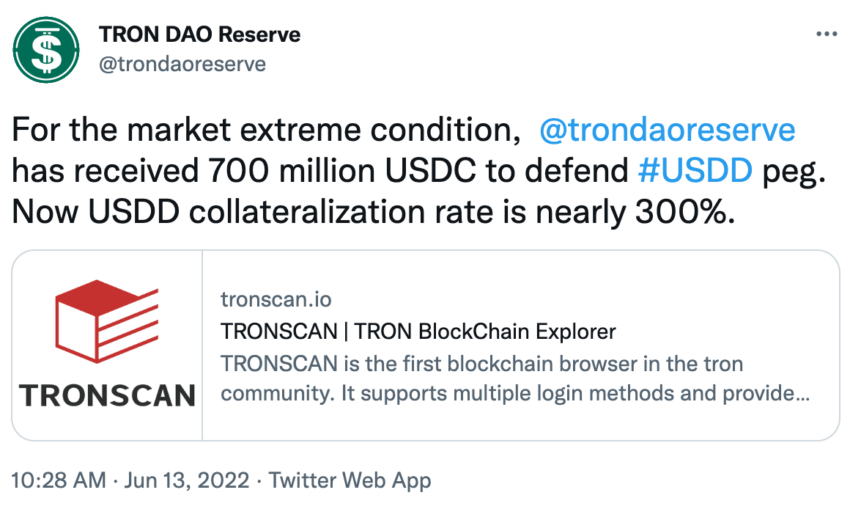 Trong trường hợp stablecoin USDD của Justin Sun, Tron DAO xác nhận rằng họ đã nhận được 700 triệu đô-la USDC để bảo vệ tỷ giá đồng USD và theo dự trữ của Tron DAO, stablecoin USDD hiện đã được thế chấp ở mức 300%.