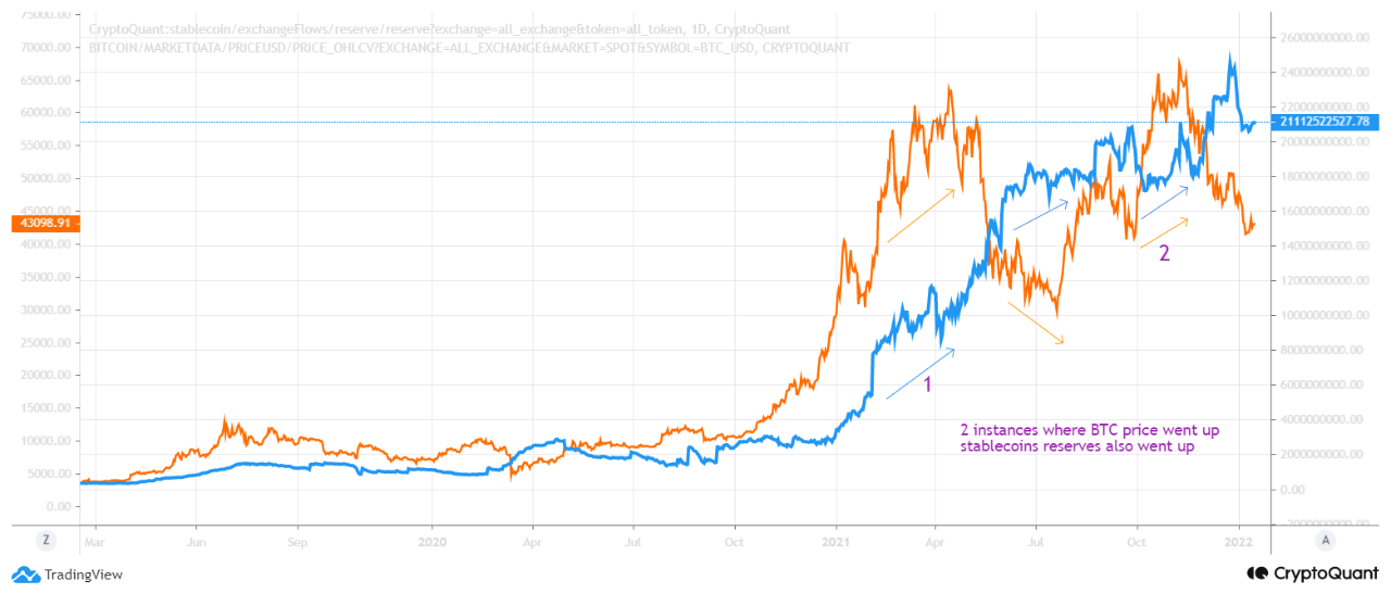 Trong phân tích on-chain, việc xây dựng hệ số tương quan giữa các chỉ số là cách để các chỉ báo ra đời. Một trong những chỉ số được quan tâm và được cho là ảnh hưởng mạnh tới giá Bitcoin nhất là lượng stablecoin được đưa lên sàn. Theo logic tư duy thông thường, mọi người sẽ cho rằng “tiền tươi” đưa lên sàn càng nhiều thì sức mua sẽ càng mạnh.