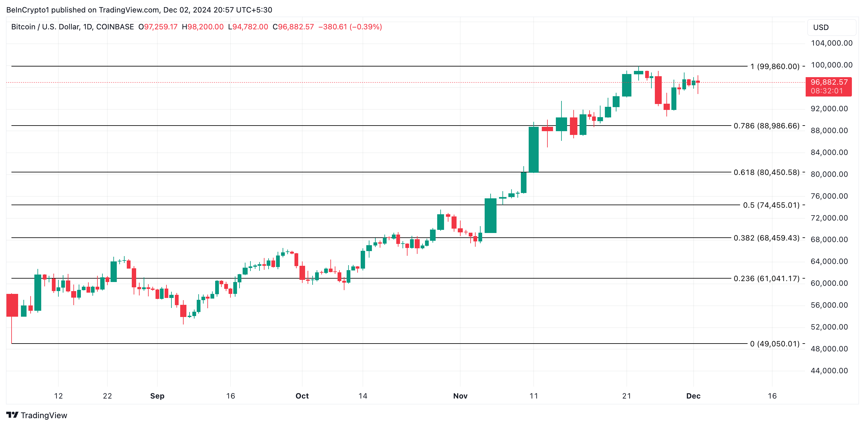 BTC hiện đang giao dịch ở mức 96,882 USD, chỉ dưới mức cao nhất mọi thời đại là 99,860 USD, vẫn là một mức kháng cự mạnh. Nếu những người nắm giữ ngắn hạn tiếp tục chiến lược “HODL” và nhu cầu mới xuất hiện — được hỗ trợ bởi dòng stablecoin trên các sàn giao dịch — Bitcoin có thể vượt qua rào cản này và tiến tới cột mốc 100,000 USD.