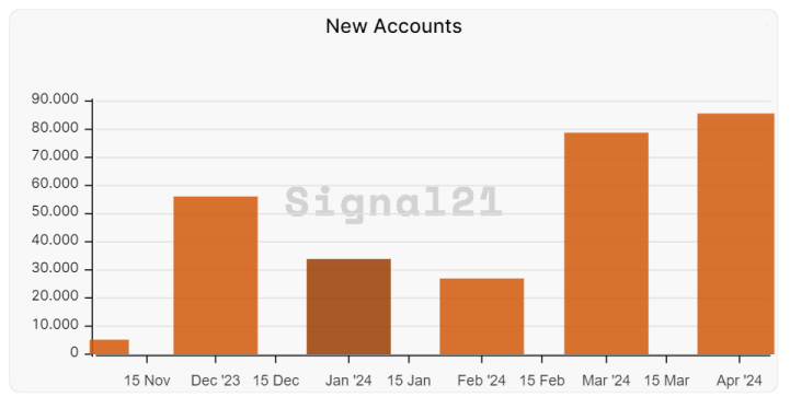 Báo cáo mới nhất của Signal21 cho biết, tháng 4 vừa qua mạng lưới đã thu hút 85,000 tài khoản mới, mức cao nhất trong một năm qua. Biểu đồ cho thấy, lượng tài khoản mới đã tăng liên tục từ tháng 2 đến nay. Bên cạnh đó, giao thức StackingDAO đã chứng kiến 30,000 người dùng mới tham gia trong tháng.