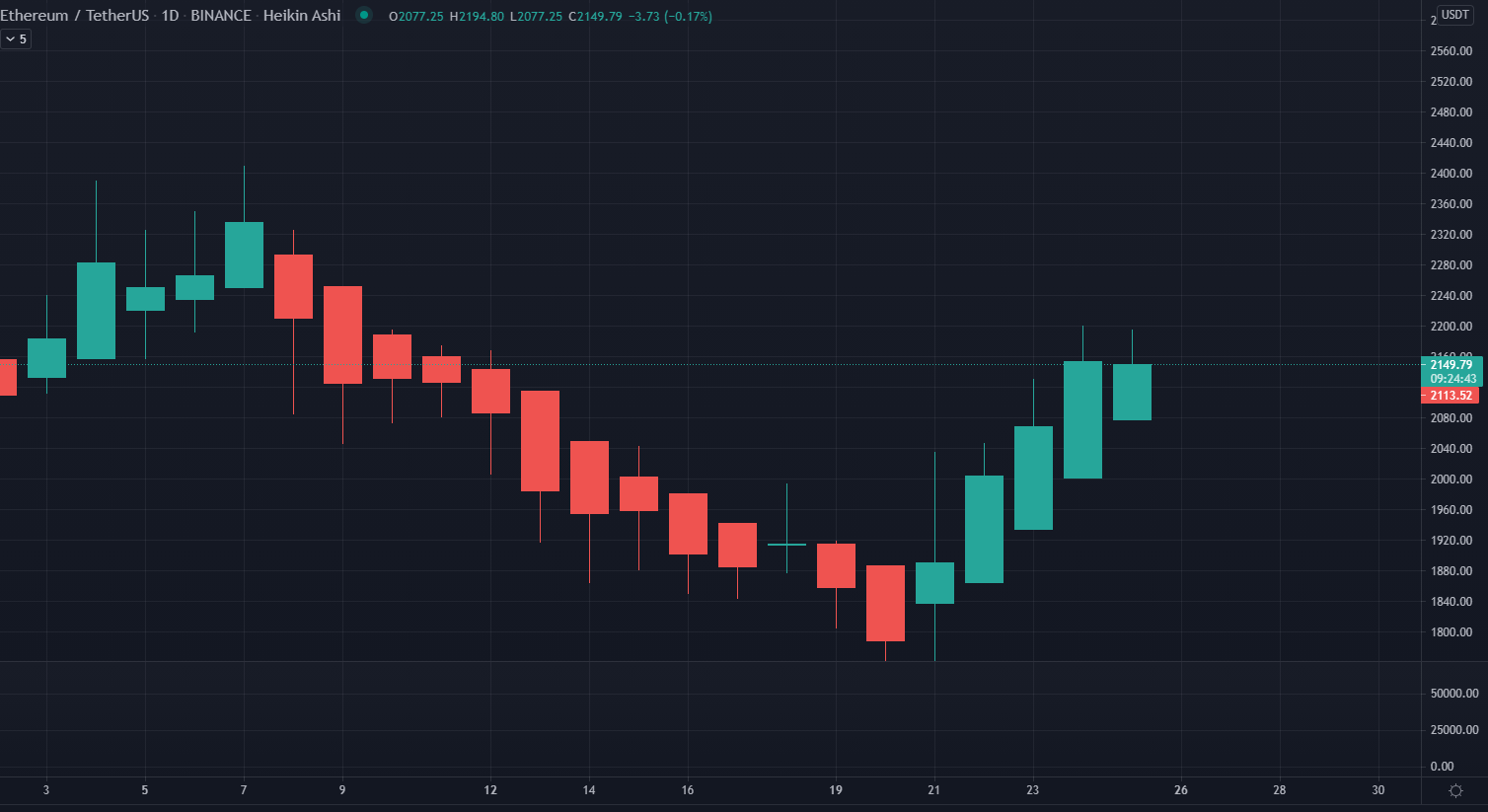 Ethereum cũng biến động theo Bitcoin trong việc cố gắng phục hồi từ mức giảm trước đó của tuần này. Giá ETH giảm xuống 1.706 đô la trước khi tăng. Trong 5 ngày giá ETH phục hồi trở lại lên mức 2.000 đô la. Hiện tại, giá ETH đã tăng lên mức $2,200 mức tăng 6.4% trong 24h qua và đã tăng 20.4% trong vòng 7 ngày qua.