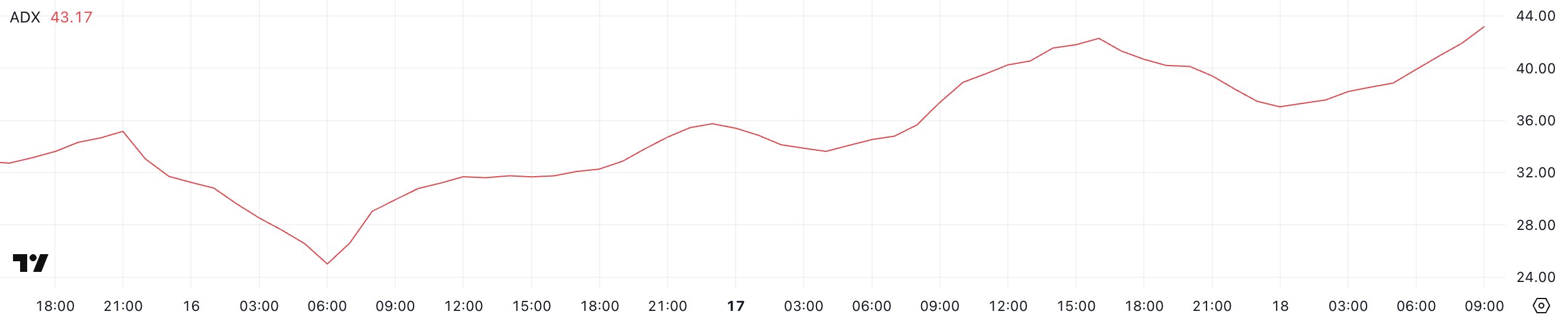 Thông thường, một chỉ số ADX trên 25 xác nhận một xu hướng mạnh, trong khi các giá trị dưới 20 cho thấy hành động giá yếu hoặc không ổn định. Sự gia tăng hiện tại cho thấy động lực đang tăng lên, với hoạt động giao dịch gia tăng và một động thái định hướng bền vững.