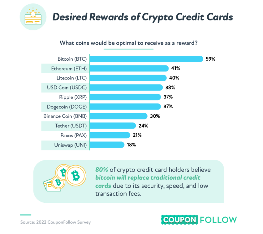 Khi không gian tiền tệ kỹ thuật số mở rộng, những người tham gia cuộc khảo sát đã nói rằng, họ sẵn sàng chấp nhận các loại tiền điện tử khác nhau để sử dụng cho thẻ tín dụng tiền điện tử của họ. Điều này bao gồm các mã thông báo không thể thay thế (NFT). Theo CouponFollow, công ty này đã tiến hành nghiên cứu và cho biết: