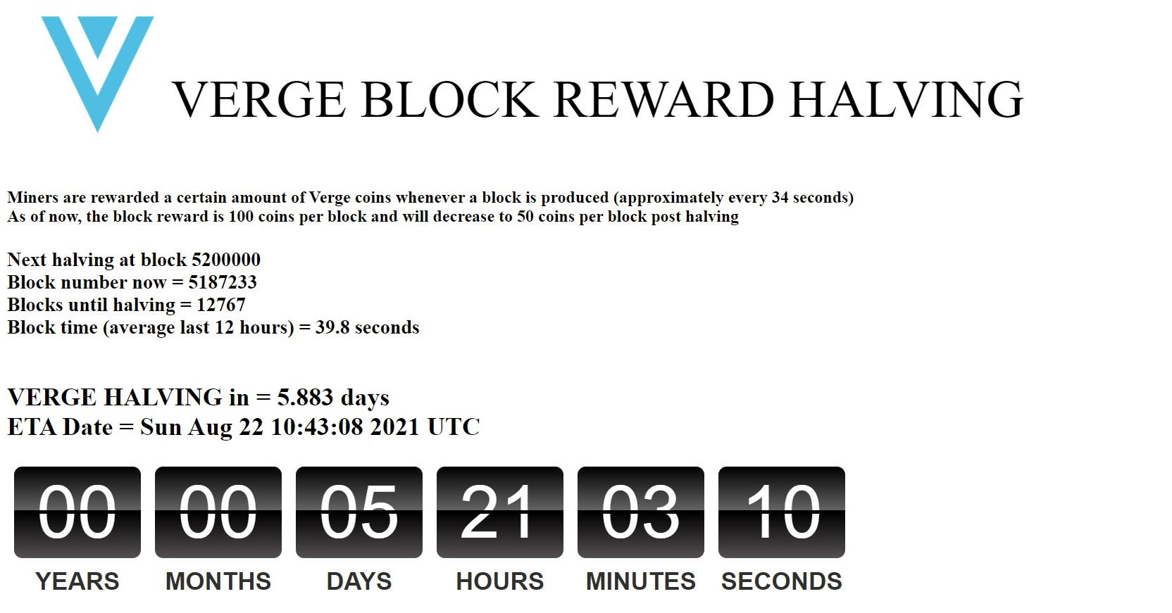 Vào ngày 22.08, Verge sẽ diễn ra đợt halving ở khối 5,200,000. Nghĩa là, phần thưởng khối của thờ đào sẽ giảm một nửa, từ 100 coin xuống còn 50 coin cho mỗi khối. Tuy nhiên, giá Verge hiện đang tăng vì thị trường chung tăng giá. Thật may mắn khi đợt Halving diễn ra sau khi thị trường downtrend.