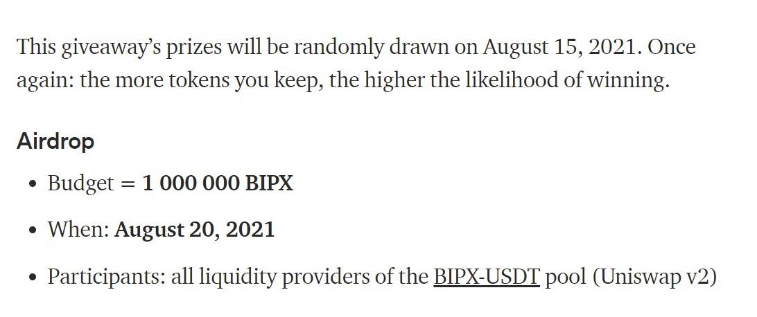 Vào ngày 20/08, nhà cung cấp thanh khoản của nhóm BIPX-USDT (Uniswap v2) sẽ nhận airdrop BIPX. Tổng nguồn cung lên tới 1 triệu BIPX token. Dĩ nhiên, nhà cung cấp nhiều tính thanh khoản cho pool thì airdrop mà họ nhận càng nhiều hơn.