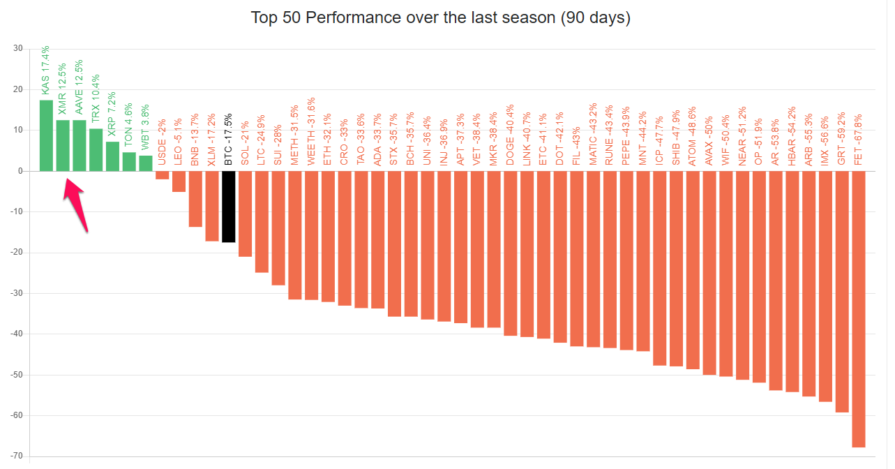 Trước khi đánh giá riêng XMR, thử so sánh hiệu suất giá XMR trong ba tháng gần đây với mặt bằng chung của các Altcoin trên thị trường. Kết quả rất ấn tượng, XMR là Altcoin có hiệu suất thứ 2 trong Top 50 Altcoin có hiệu suất giá hàng đầu trong 90 ngày qua. XMR vẫn giữ mức tăng 12.5% trong 90 ngày, chỉ xếp sau Kaspa (KAS).