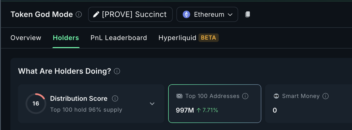 Giờ đây, điều này trở nên thú vị hơn. Mặc dù có sự biến động ban đầu, 100 người nắm giữ hàng đầu đã thêm 7.71% token, hiện đang nắm giữ 96% tổng cung. Sự gia tăng tập trung sở hữu này cho thấy việc tích lũy sớm đang diễn ra. Có khả năng từ những người tham gia dài hạn, hoặc là người trong cuộc hoặc cá voi, dự đoán sức mạnh trong mô hình token của Succinct.