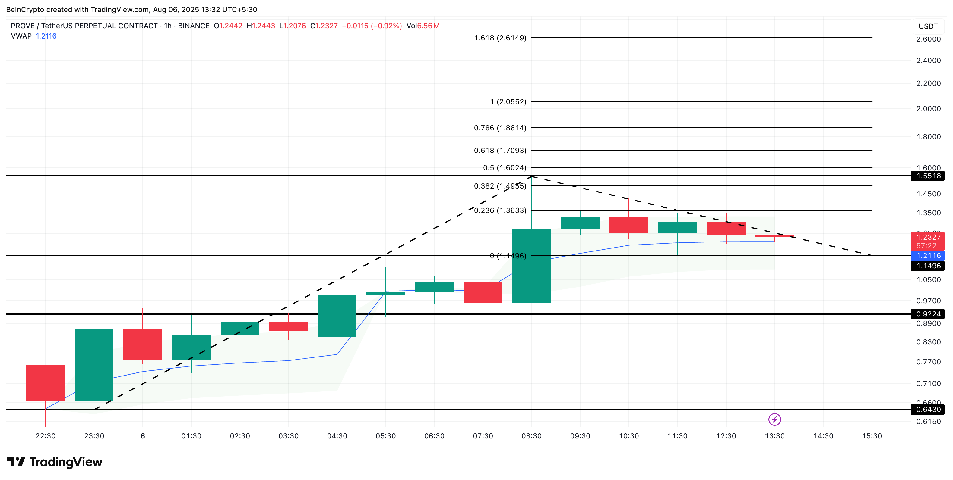 Nếu giá Succinct (PROVE) phá vỡ 1.49 USD (theo biểu đồ 1 giờ), điều đó cũng có nghĩa là một sự phá vỡ cờ hiệu. Tuy nhiên, một mức phá vỡ rõ ràng được hỗ trợ bởi xu hướng nằm trên 1.61 USD, cũng phù hợp với biểu đồ Fib 1 giờ từ trước đó.