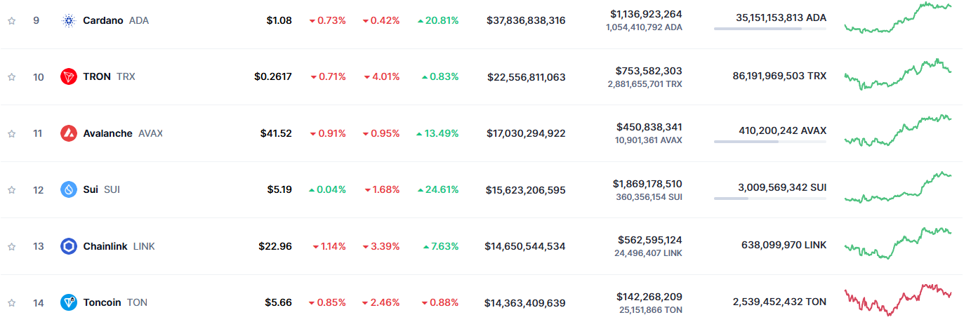 CoinMarketCap cho thấy, với vốn hóa thị trường hiện tại hơn 15.5 tỷ USD, SUI đã chính thức vượt LINK và TON. Trong khi đó, LINK và TON vốn là những dự án có lượng nhà đầu tư đông đảo và hệ sinh thái phong phú hơn.