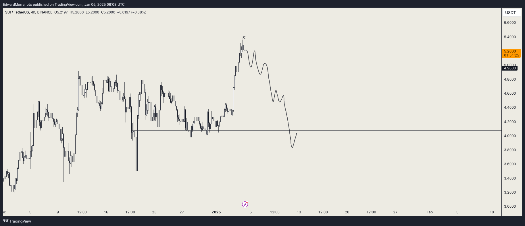 Trong bối cảnh giá SUI tăng nóng, áp lực chốt lời có thể xuất hiện và mạnh mẽ khiến giá điều chỉnh bất cứ lúc nào. Nhà đầu tư Edward Morra (MBA) dự đoán khả năng SUI sẽ điều chỉnh trong ngắn hạn về lại vùng 4 USD.