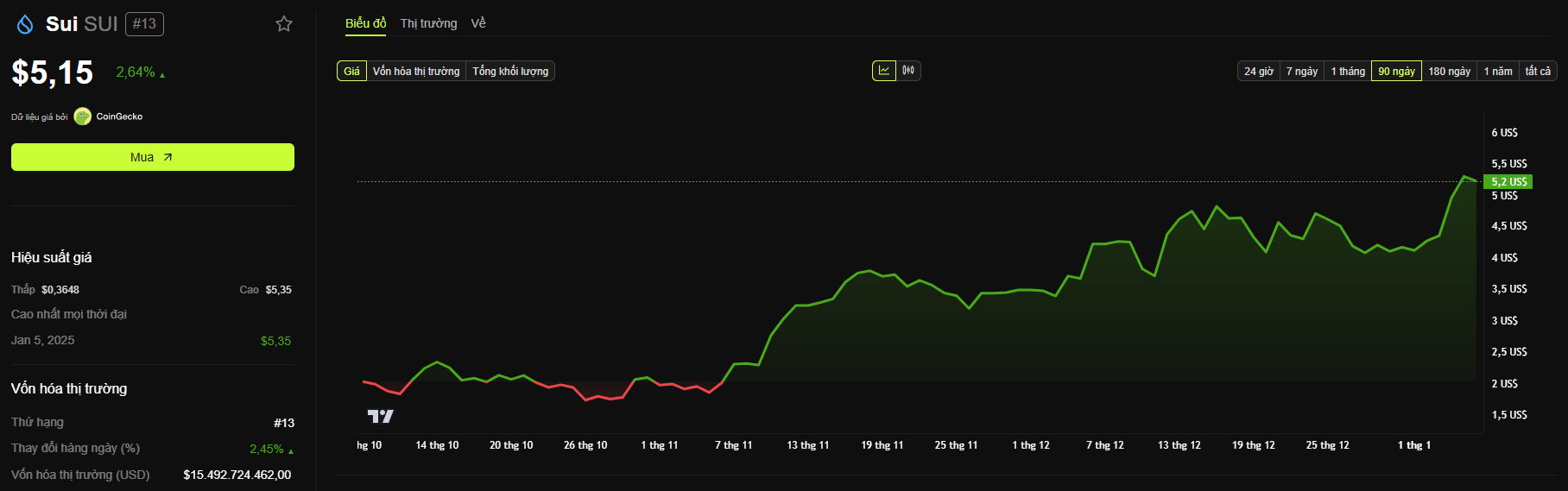 Dữ liệu BeInCrypto cho thấy, SUI đang được giao dịch trên 5 USD, có thời điểm đạt mức ATH mới tại 5.36 USD. SUI trải qua tuần đầu tiên của năm 2025 với nến tuần xanh với biên độ lớn, tăng 35%. Nếu tính từ đầu tháng 12 năm ngoái đến nay, SUI đã tăng hơn 200%.