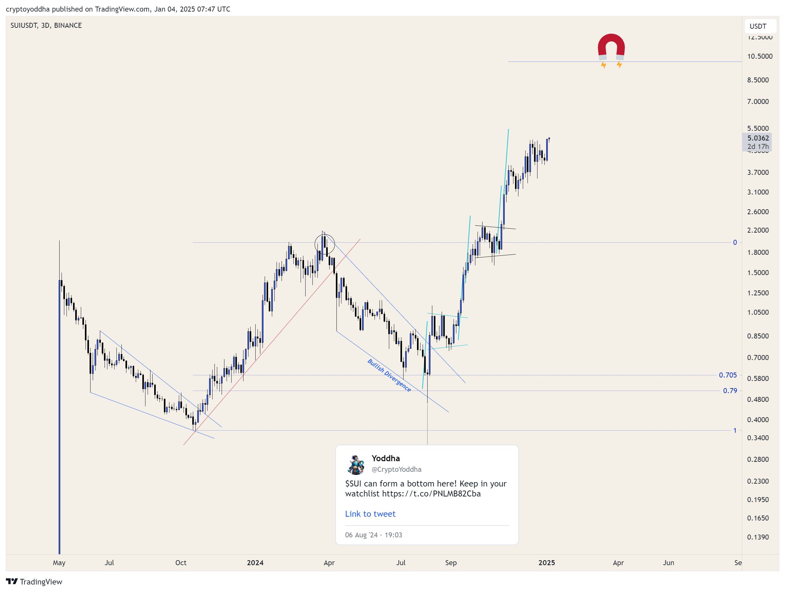 Nhà giao dịch Yoddha bày tỏ kỳ vọng tích cực hơn, rằng SUI có thể tiếp tục còn tăng cao hơn nữa và đạt đến 10 USD.