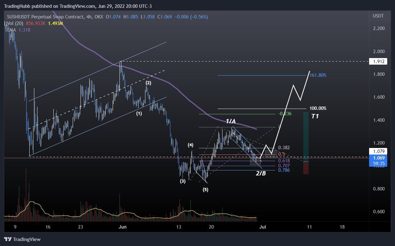 Việc giảm xuống dưới mức thấp của sóng B (đường màu đỏ) tại 0.92 USD sẽ làm mất hiệu lực của mô hình sóng như hình trên. Có khả năng, SUSHI sẽ rơi về mức thấp mới dưới 0.86 USD.