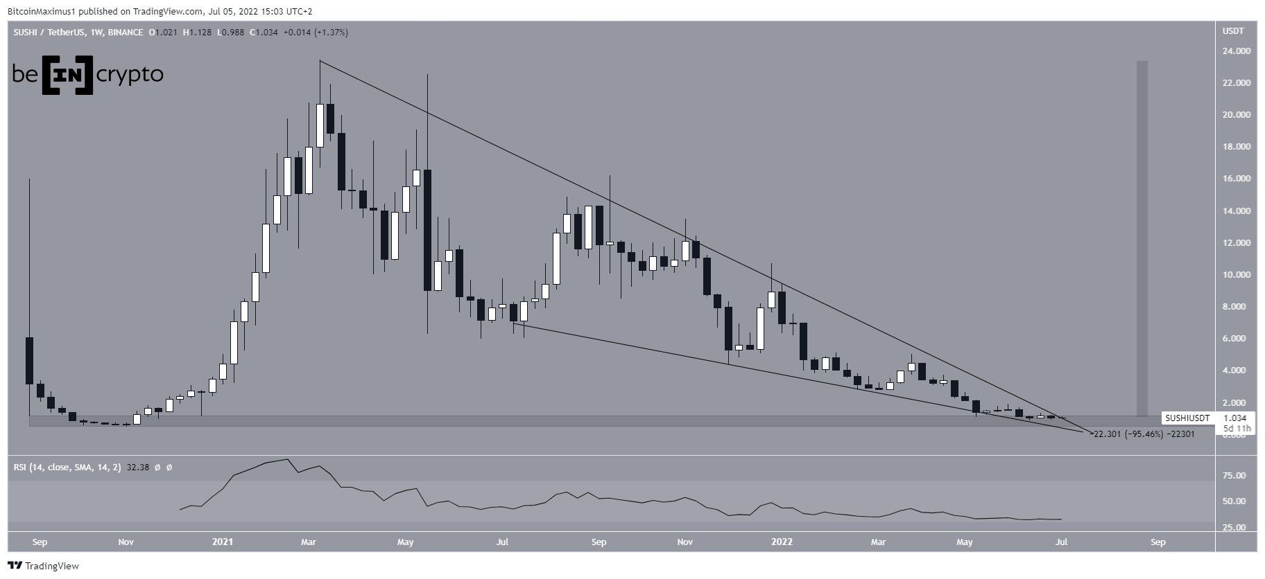 Giá SUSHI đã giảm kể từ mức đỉnh lịch sử 23.43 USD vào tháng 3 năm 2021. Đà giảm giá được kiềm chế bên trong một mô hình nêm giảm dần. Đây thường được coi là một mô hình tăng giá.