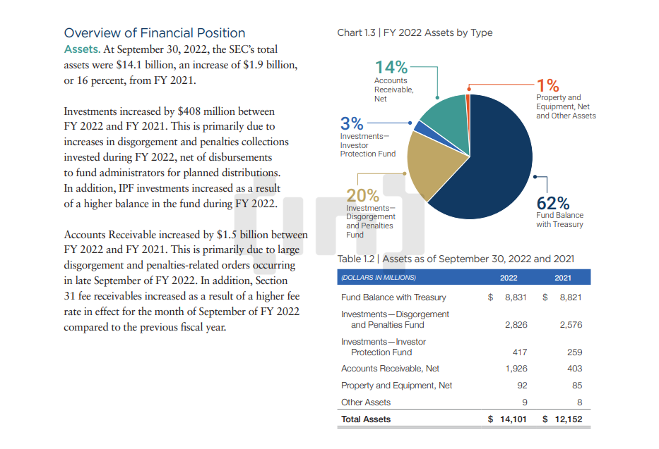 SponsoredTheo báo cáo thường niên năm 2022 của SEC, tổng tài sản của họ đã tăng từ mức 12.2 tỷ USD lên mức 14.1 tỷ USD. Như vậy, chỉ sau một năm tài chính, tài sản của SEC đã tăng thêm 1.9 tỷ USD. Đáng chú ý, các khoản phải thu (Accounts Receivable) đã tăng đáng kể thêm 1.5 tỷ USD lên 1.926 tỷ USD. Việc tăng này chủ yếu đến từ các khoản phạt lớn xảy ra đến cuối tháng 9/2022.