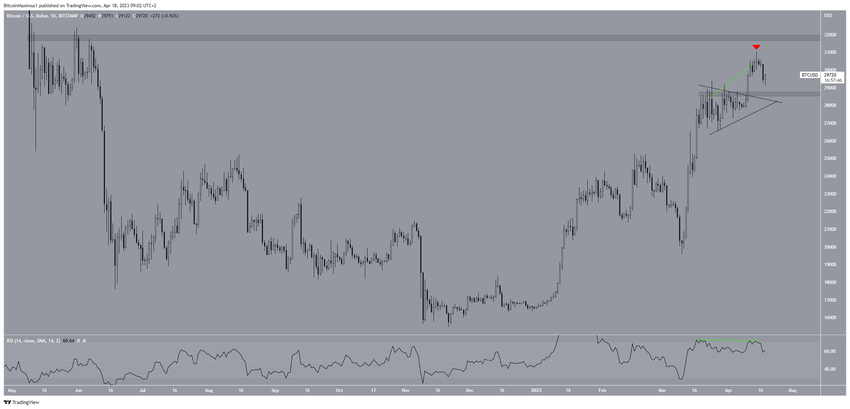 Giá Bitcoin đã bùng phát từ một tam giác đối xứng vào ngày 10/4, đạt mức đỉnh mới hàng năm là 30,978 USD vào ngày 14/4. Tuy nhiên, BTC chưa thể tiếp cận vùng kháng cự gần nhất tiếp theo ở mức 31,800 USD. Hơn nữa, chỉ số RSI hàng ngày tạo ra sự phân kỳ giảm giá (đường màu xanh lá cây), một dấu hiệu thường báo trước sự đảo ngược xu hướng giảm giá. Giá Bitcoin giảm mạnh vào ngày 17/4, dẫn đến mức đáy trong ngày 29,240 USD.