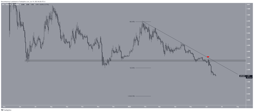Trong khi đi theo đường này, APE cũng giảm xuống dưới khu vực 3.25 USD và xác nhận đây là mức kháng cự (biểu tượng màu đỏ).