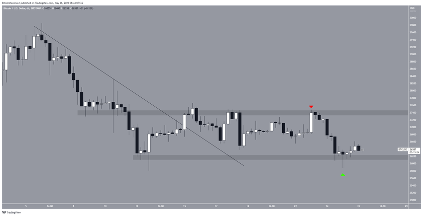 SponsoredVào ngày 25/5, BTC đã giảm xuống vùng hỗ trợ 26,200 USD và bật lên (biểu tượng màu xanh lục) sau đó, tạo ra một thanh nến có bóng nến dài phía dưới.