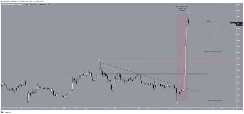 Bất chấp dự đoán tăng giá này, nếu giá BCH giảm xuống dưới mức cao nhất của sóng (đường màu đỏ) ở mức 155 USD, điều đó có nghĩa là xu hướng vẫn đang giảm. Trong trường hợp đó, việc giảm xuống mức hỗ trợ gần nhất ở mức 110 USD sẽ là kịch bản có khả năng xảy ra nhất.