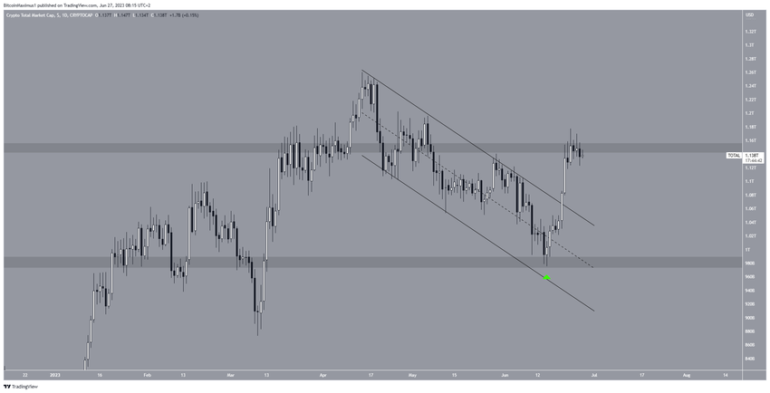 TOTALCAP đã tăng đáng kể kể từ khi tăng lên mức 980 tỷ USD vào ngày 15/6 (biểu tượng màu xanh lá cây). Sự gia tăng đã gây ra sự đột phá từ một kênh song song giảm dần năm ngày sau đó, dẫn đến mức cao nhất là 1.17 nghìn tỷ USD vào ngày 23/6. Điều này đã đưa giá đến vùng kháng cự 1.15 nghìn tỷ USD.