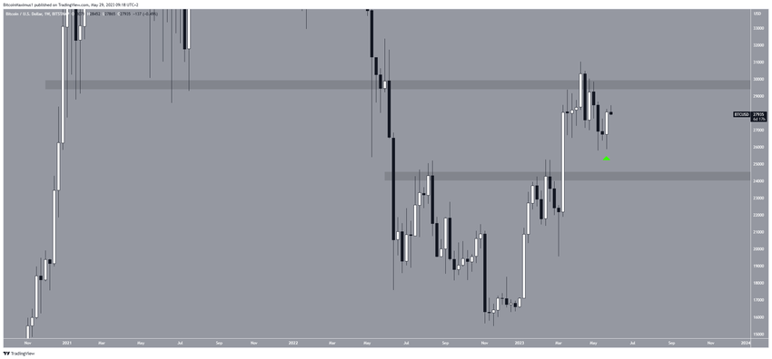 Tương tự với TOTALCAP, giá Bitcoin đã tạo ra một nến tăng vào tuần trước (biểu tượng màu xanh lục) kết thúc đợt giảm trước đó bắt đầu vào tháng Tư. Tuy nhiên, BTC vẫn giao dịch dưới vùng kháng cự chính ở mức 29,800 USD.